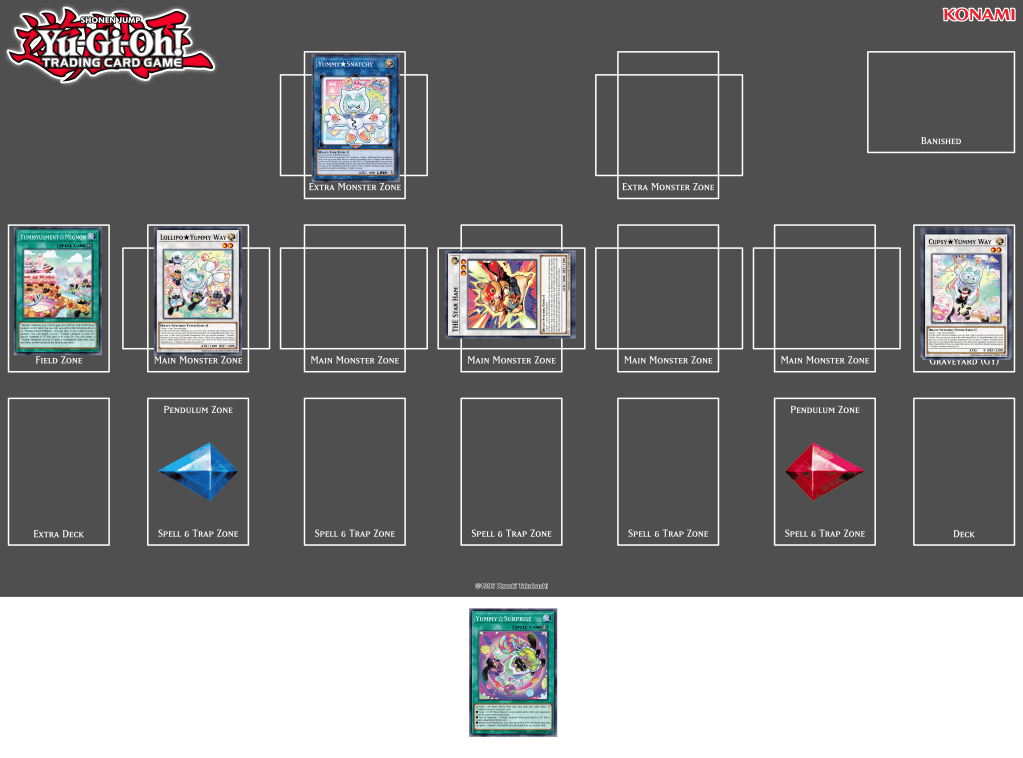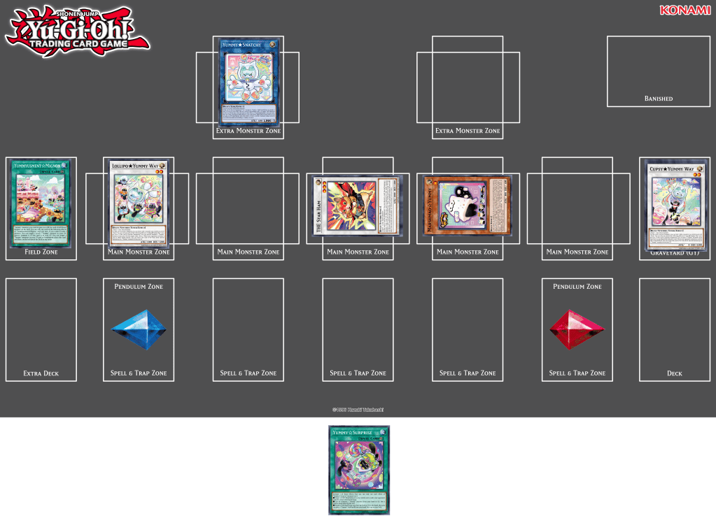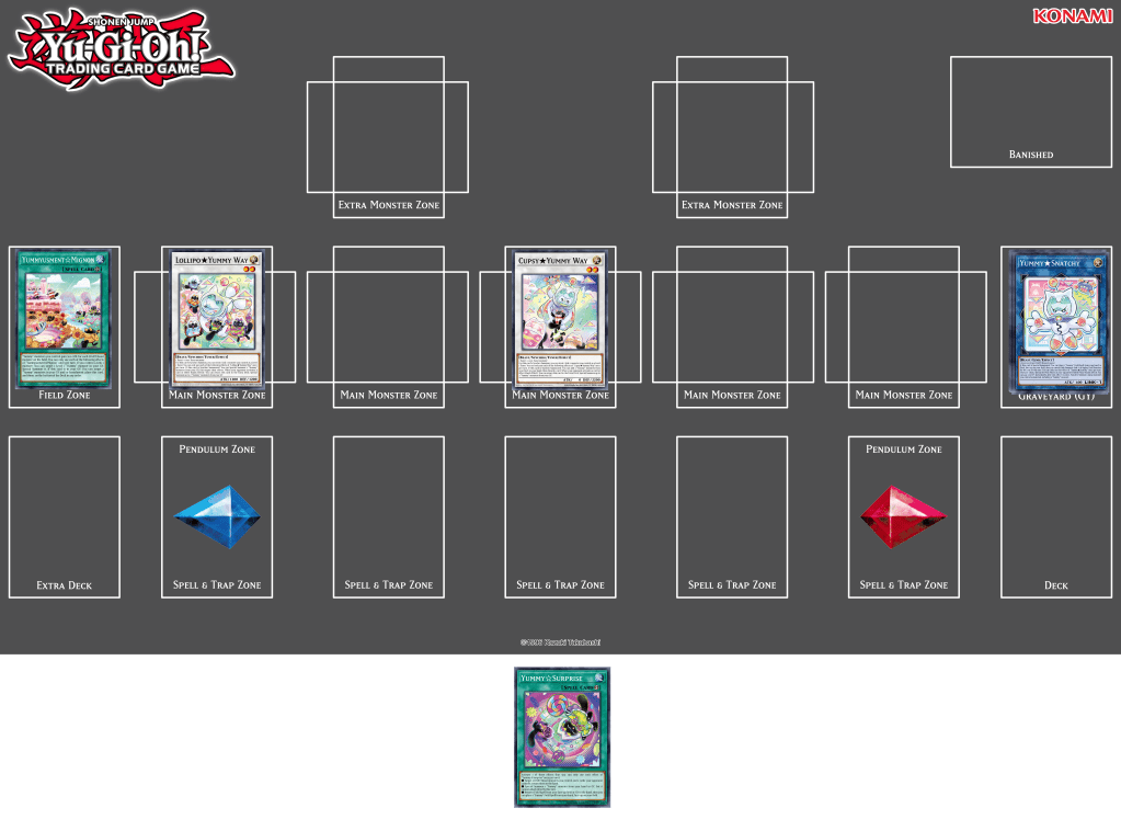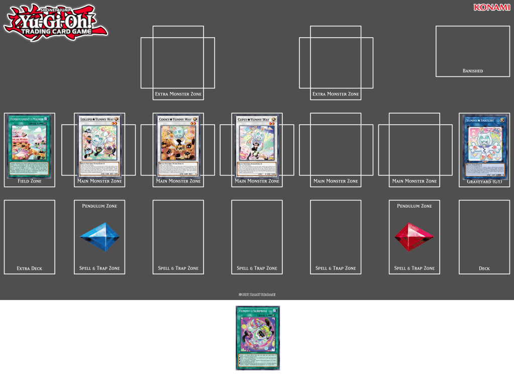 • Return 1 Field Spell from your face-up field or GY to the hand, then you can place 1 “Yummy” Field Spell from your hand, face-up on your field.